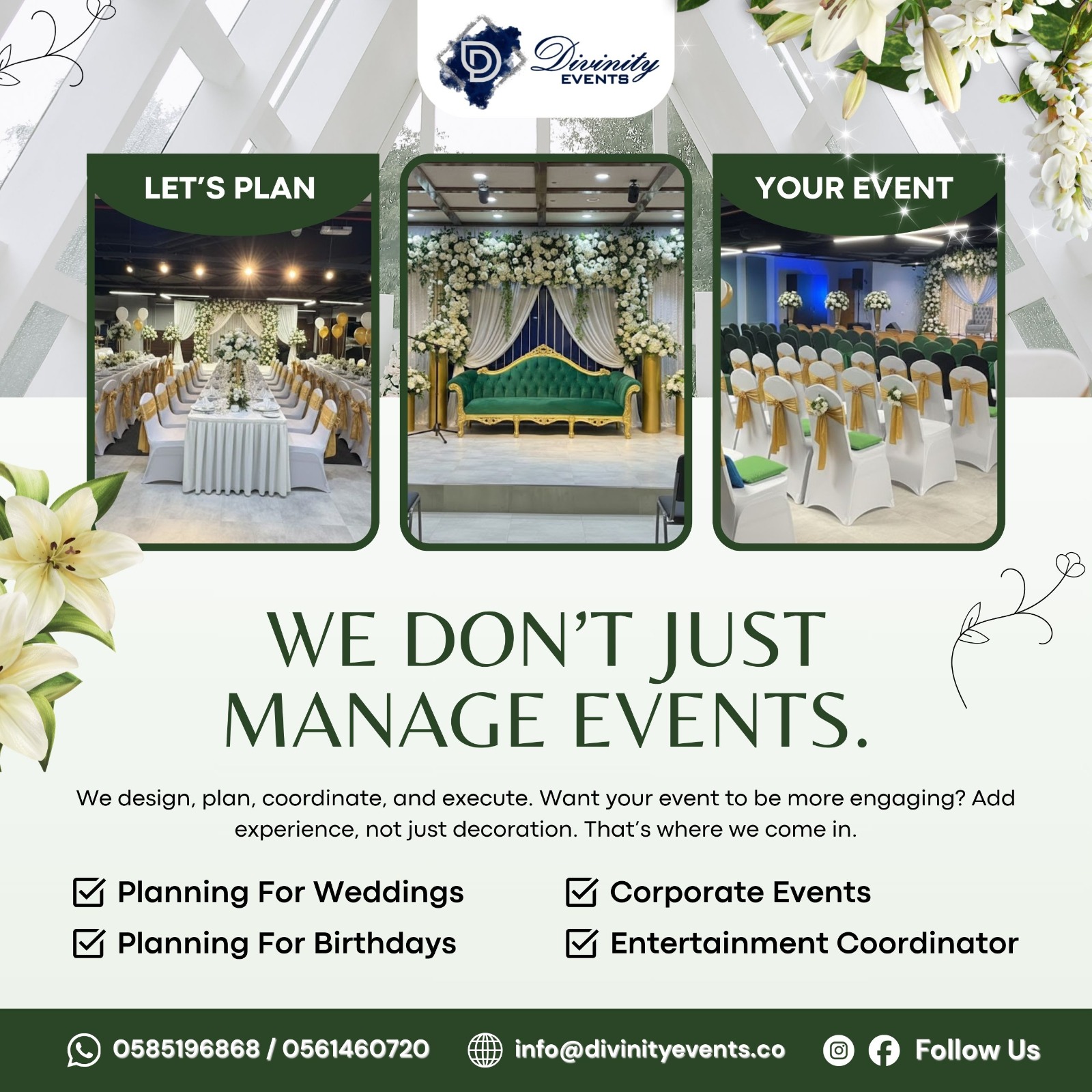 Divinity Events offers a comprehensive suite of event planning and styling services. Whether you dream of a lavish wedding, a corporate gala, or a cozy birthday party, we have the expertise to make it spectacular.